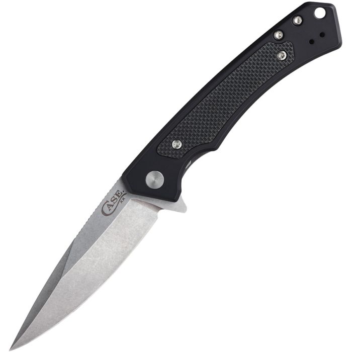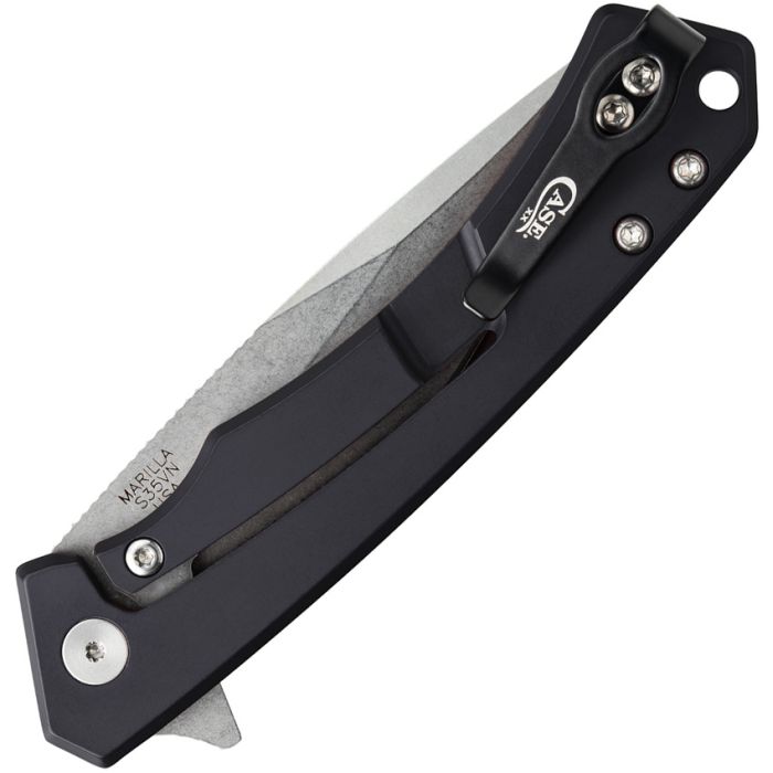 MARILLA pattern. 4.75" (12.07cm) closed. 3.75" (9.53cm) stonewash finish S35VN stainless blade. Black aluminum handle with black G10 inlay. Extended tang. Pocket clip.