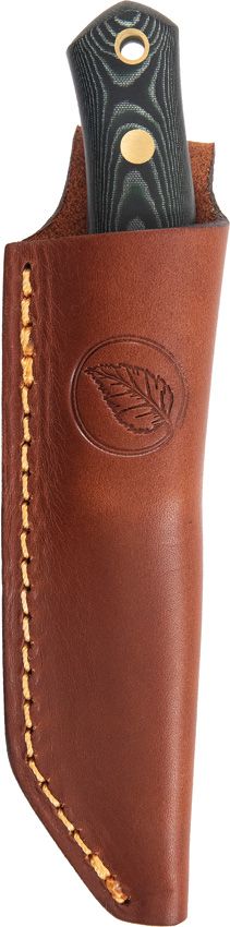 7.5" (19.05cm) overall. 3.25" (8.26cm) Scandi grind 14C28N Sandvik stainless blade. Green micarta handle. Full tang. Lanyard hole. Brown leather belt sheath.