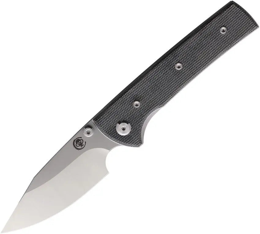 4.38" (11.13cm) closed. 3.38" (8.59cm) stonewash and satin finish Elmax steel spear point blade. Black canvas micarta handle. Thumb stud. Pocket clip.
