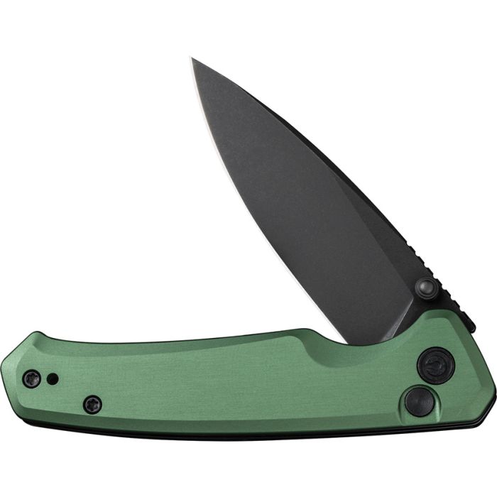 4" (10.16cm) closed. 3" (7.62cm) black stonewash finish Nitro V steel drop point blade. Green aluminum handle. Thumb stud. Pocket clip. Black nylon zippered storage case. Button Lock