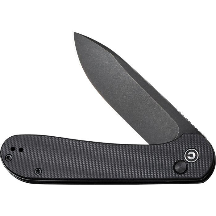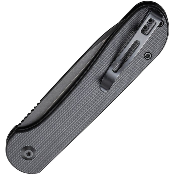 4.5" (11.43cm) closed. 3.5" (8.89cm) black stonewash finish 14C28N Sandvik stainless blade. Black G10 handle. Pocket clip.