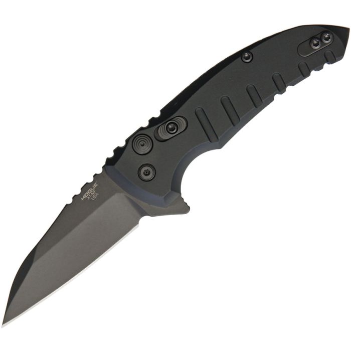 4" closed. 2.75" black finish 154CM stainless Wharncliffe blade. Black matte finish aluminum handle. Extended tang. Pocket clip. Black nylon zippered storage case.