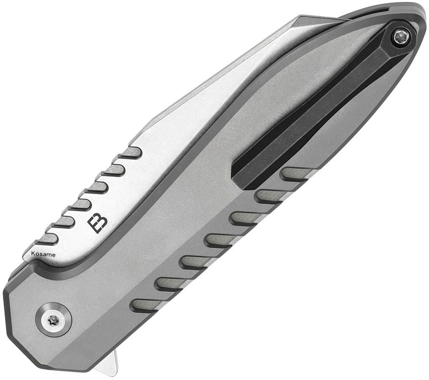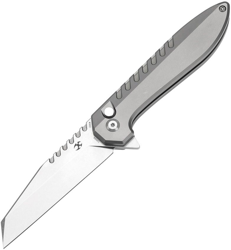 4.5" (11.43cm) closed. 3.38" (8.59cm) stonewash finish 154CM stainless Wharncliffe blade. Stonewash finish titanium handle with jade G10 inlay. Extended tang. Pocket clip.