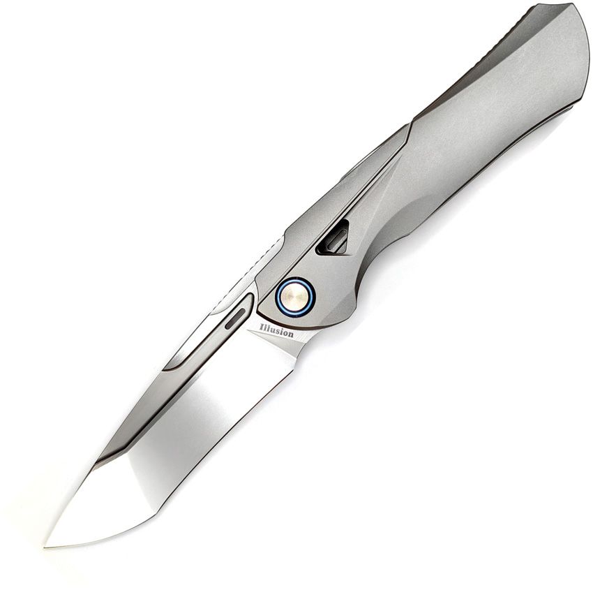 4.75" (12.07cm) closed. 3.5" (8.89cm) satin finish Bohler M390 stainless drop point blade. Gray titanium handle. Extended tang. Pocket clip.