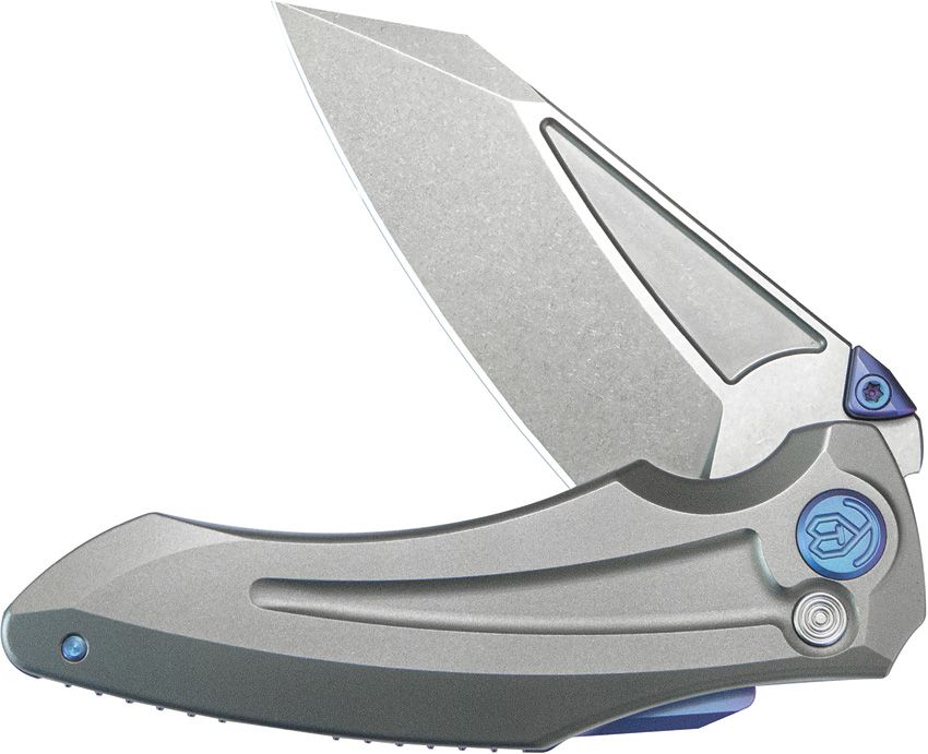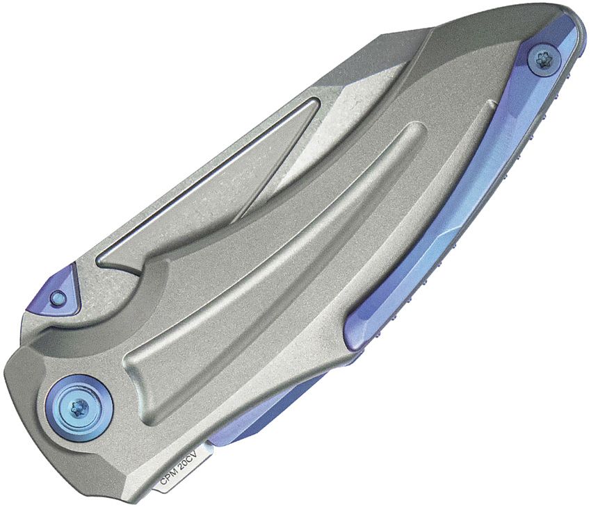 4.13" (10.49cm) closed. 3.13" (7.95cm) stonewash finish CPM-20CV stainless blade. Stonewash finish titanium handle. Thumb disk. Pocket clip. Blue anodized accents.
