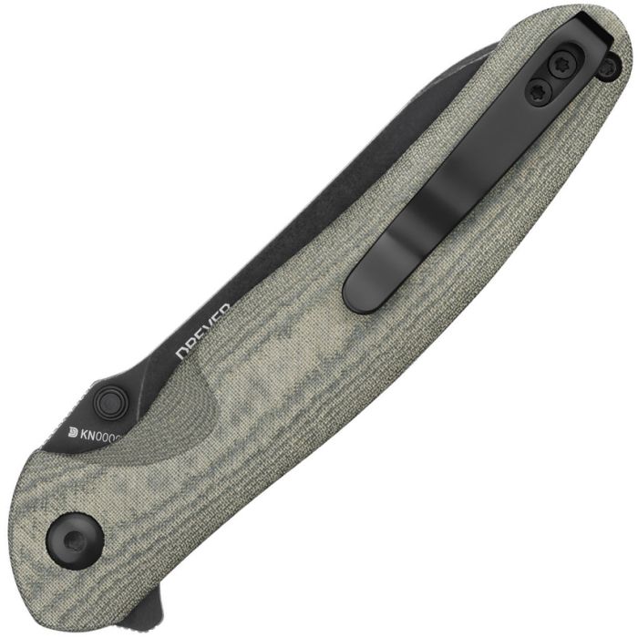 4.5" (11.43cm) closed. 3.5" (8.89cm) black finish Bohler N690 stainless blade. Green micarta handle. Thumb stud. Extended tang. Pocket clip.