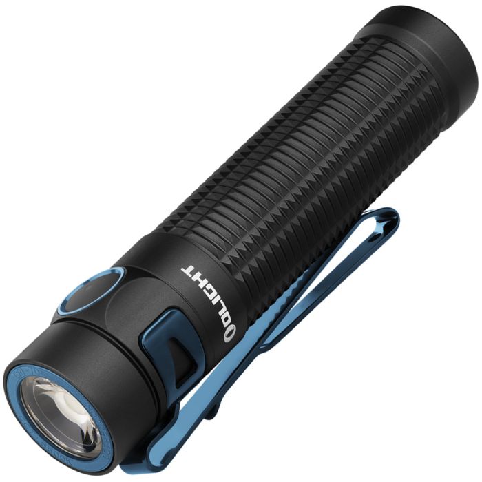 4" overall. Clip. Water resistant. Impact resistant. Strobe. Rechargeable. Modes: Turbo (1500-600 lumens, 2+177m); High (600-120 lumens, 180+25m runtime); Medium (120 lumens, 17h runtime); Low (15 lumens, 100h runtime); Moon (0.5 lumen, 120 day runtime). TIR optic lens. Side switch. MCC3 charging cable. L-shaped stand. Pouch. Requires (1) 18650 battery (included). Aluminum construction. Color: Black.