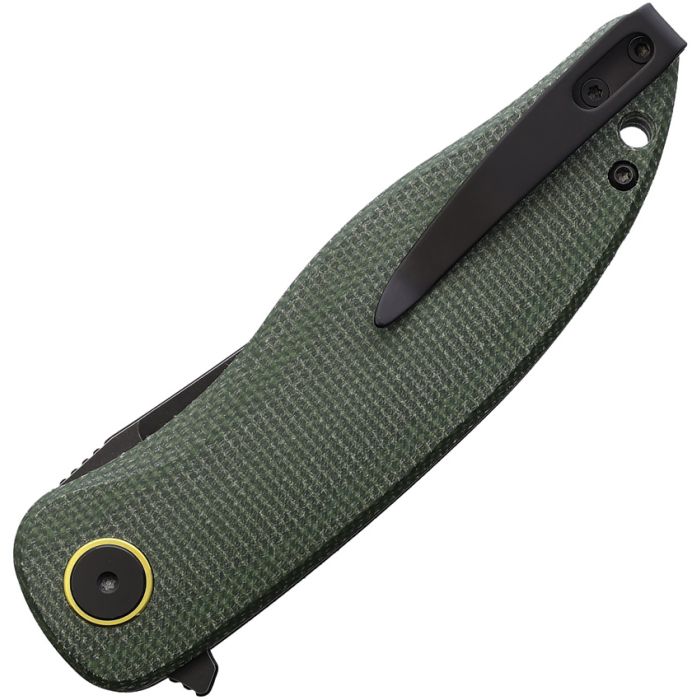 4.63" (11.76cm) closed. 3.5" (8.89cm) black stonewash finish Bohler K110 stainless curved blade. Green canvas micarta handle. Extended tang. Lanyard hole. Pocket clip.