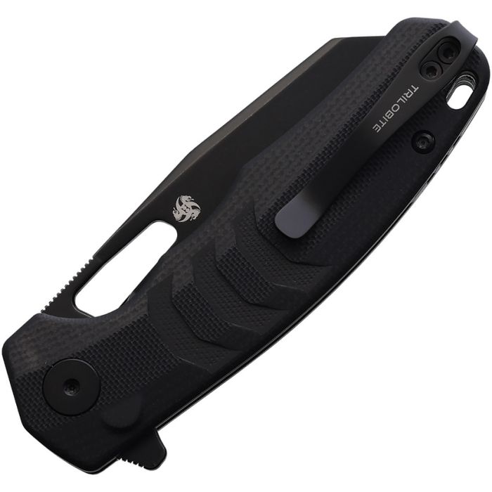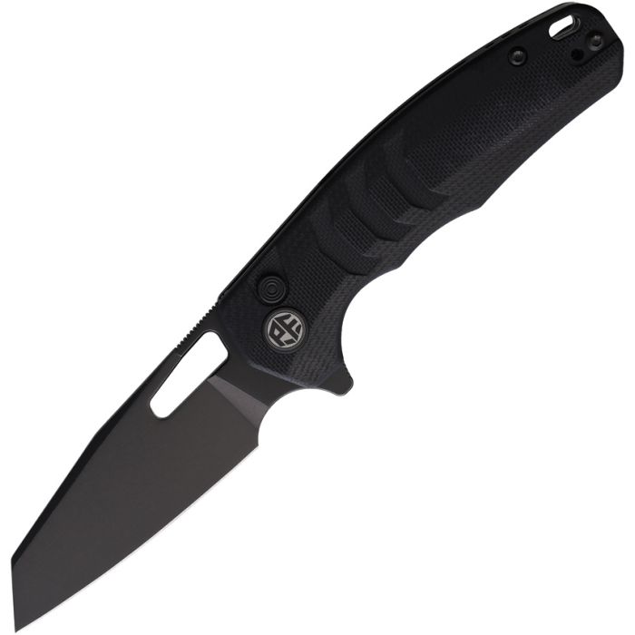 4" (10.16cm) closed. 3" (7.62cm) black stonewash finish 14C28N Sandvik stainless reverse tanto blade. Black G10 handle. Extended tang. Button lock. Thumb pull. Lanyard hole. Pocket clip.