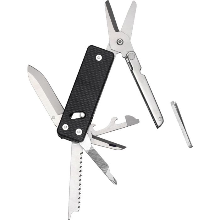 3.38" closed. 5.38" overall. Black G10 handles. Tools include: Scissors l Tweezers l Phillips screwdriver l Saw blade l File l Bottle opener l Can opener l Glass breaker l Awl l Flat head screwdriver l Pocket clip. D2 steel blade. Include bit driver set.
