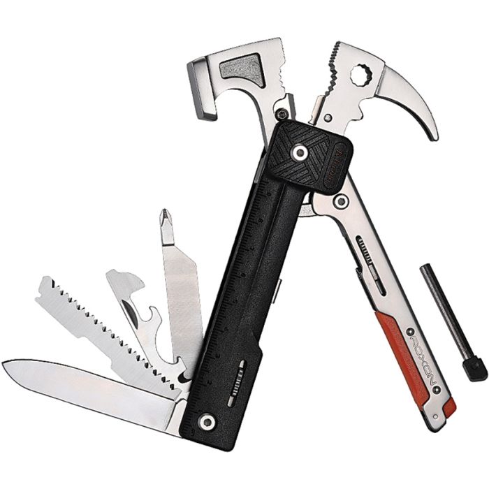 6" closed. ABS handles. Tools include: Pliers l Wire cutter l Ruler l File l Phillips screwdriver l Bottle opener l Wire stripper l Can opener l Flat head screwdriver l Saw blade l Small blade. Nail puller I Spanner I Linesman plier I Hammer I Flint stone.