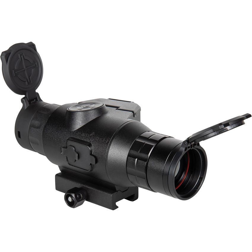 Dimensions: 6.6" x 3" x 2.9". Actual magnification: 1-8x. Weight: 21.4oz. 384 x 288 thermal resolution. OLED display. Five color palettes and nine reticle colors. 10 reticles. Five weapon profiles. Built-in recording with sound. 17 pixel pitch. Spectral range: 8-14. 35mm lens diameter. Micro SD card not included. Flip-up covers (front and back). Removable throw lever. Rubber eyecup. USB cable.