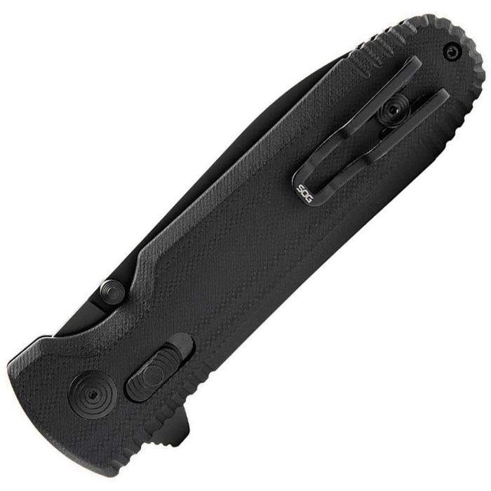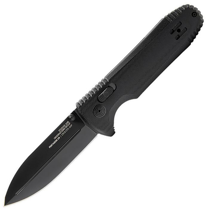 4.75" (12.07cm) closed. 3.63" (9.22cm) black oxide coated CTS-XHP stainless spear point blade. Black G10 handle. Thumb stud. Pocket clip. Extended tang.