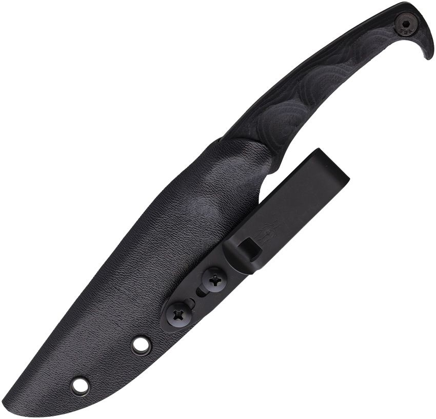 8" (20.32cm) overall. 4" (10.16cm) 1095HC steel blade. Full tang. Acid etch and rock tumbled blade. Black sculpted layered nitrile and G10 handle. Black Kydex belt sheath. USA.