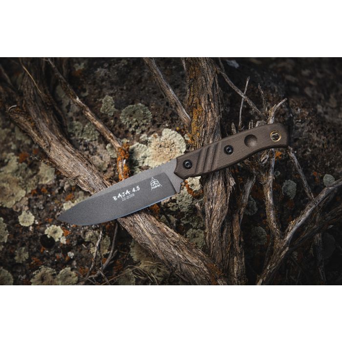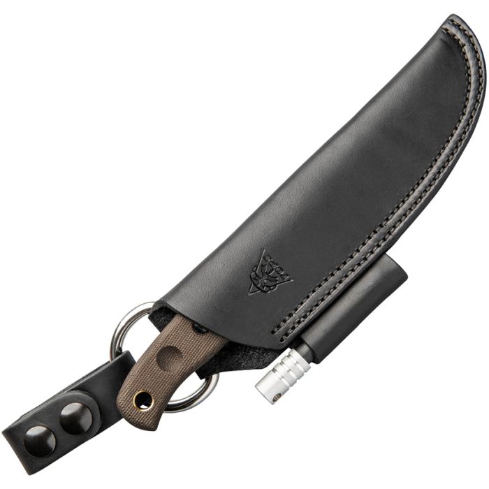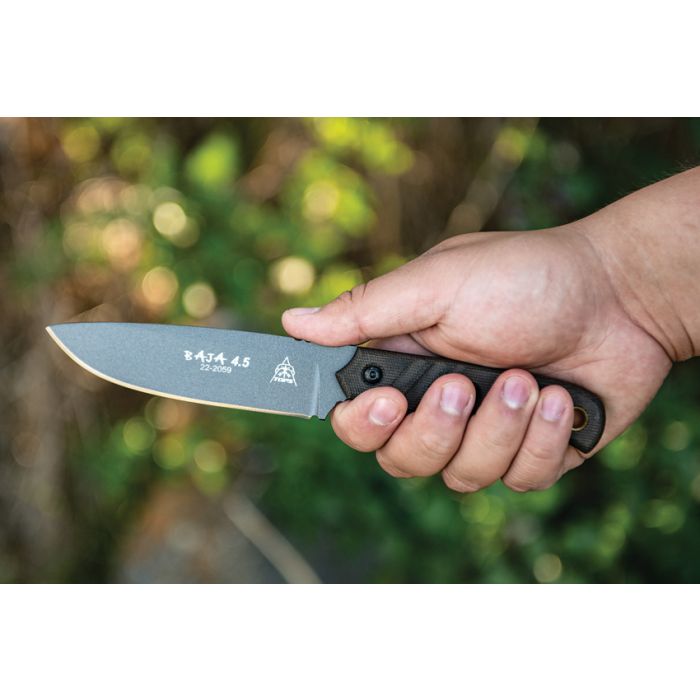 9 1/4" overall. 4 7/8" 1095 high carbon steel blade with black river wash finish. Full tang. Green canvas micarta handles. Oversized lanyard hole. Black leather belt sheath. Comes with TOPS emergency whistle and 3 1/8" overall fire starter with 2" rods.