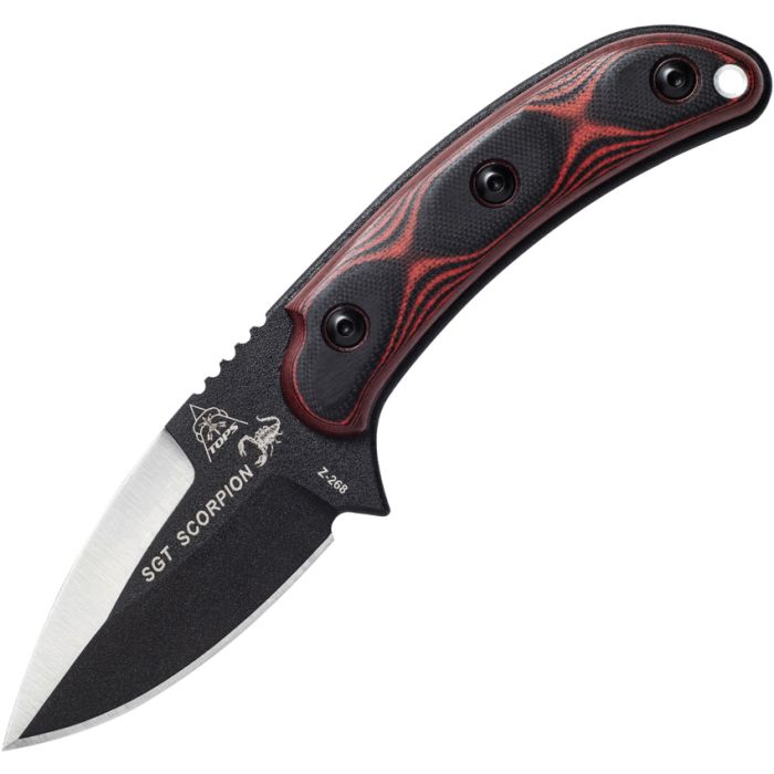 7 7/8" overall. 3 1/4" black traction coated 1095 carbon steel blade. Red and black micarta handles with lanyard hole. Black Kydex sheath.