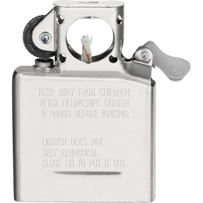 Fits Classic Zippo lighter case. Interchangeable with traditional Zippo lighter insert. Does not fit Slim or 1935 replica cases. Chrome finish metal construction. Takes lighter fuel (not included). Insert Only.